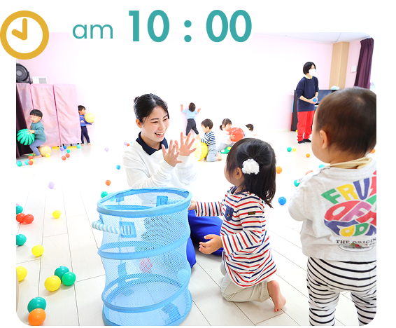 今日は何をして遊ぼうかな?みんながそろうと嬉しいね。大好きな歌を歌ったり、体操をしたり・・・「楽しいね!」子ども達の笑顔でいっぱい♪